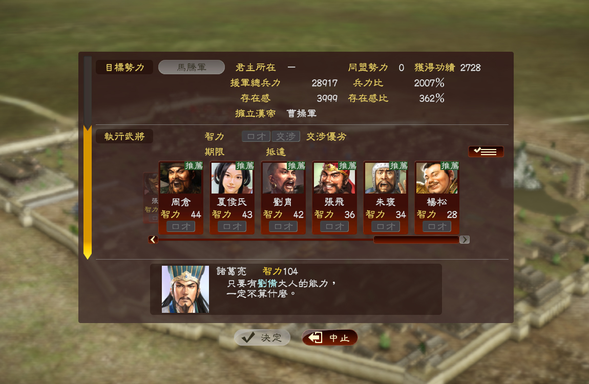 而弘農方面的部隊,則忙於應付來自四面八方的攻擊,使主力軍難以繼續深入,戰況有點兒陷入膠著。所以,當發現弘農附近的敵軍軍力有所減弱之際,記得當機立斷,立即分兵攻打宛城及新野,以解襄陽之圍!同時間,可以叫大量西涼及蜀地的雜牌軍,站在弘農上面負責防守,防守方面,如果交給電腦去做的話,只要兵力比對方多,就很容易守得住城池的了,所以不用擔心武將的強弱(不過我仍盡量留意攻擊力要有100以上才會放心編成電腦部隊)。